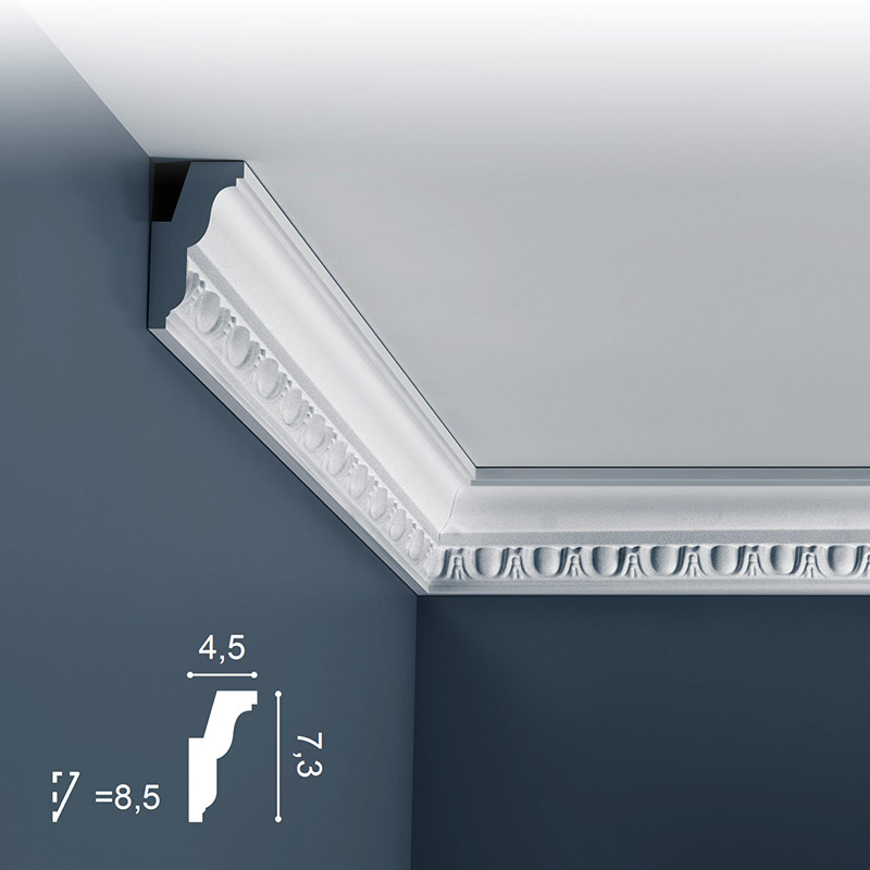 Listwa sufitowa C212 jest elementem sztukaterii wewnętrznej, o wyróżniającej się stylistyce, służącym do wykończenia miejsca pomiędzy ścianą i sufitem. Świetnie maskuje miejsce styku łączonych powierzchni oraz podwyższa optycznie wnętrze.