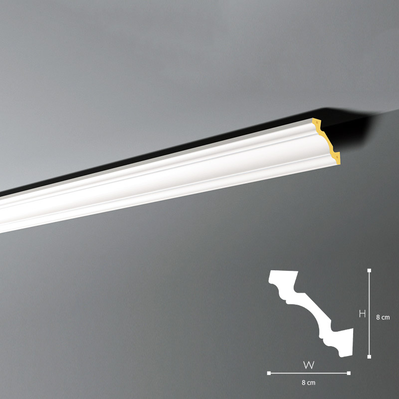 Oferowany gzyms sufitowy harmonijnie łączy powierzchnię ściany z sufitem i maskuje miejsce ich styku. Dodatkowo sprawia, że pomieszczenie wydaje się optycznie wyższe.